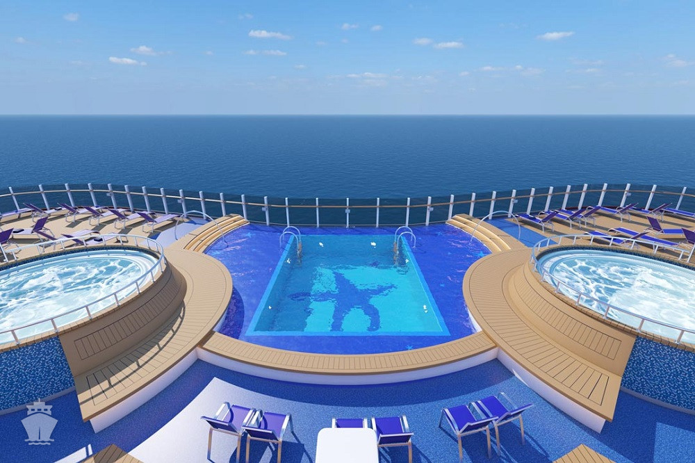 Serenity (18. paluba) 8:00 - 23:00. Oddychová zóna pre dospelých 21+ s bazénom, barom, lehátkami a kreslami a 2 vírivkami.
