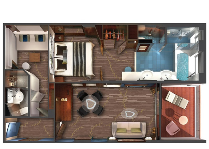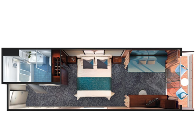SD - Forward-facing Deluxe Penthouse 46 m² / balkón 13 m². 10. paluba - vpredu. Max 4 osoby. Výhody Suite. | 5 592 € 2 796 € za osobu |