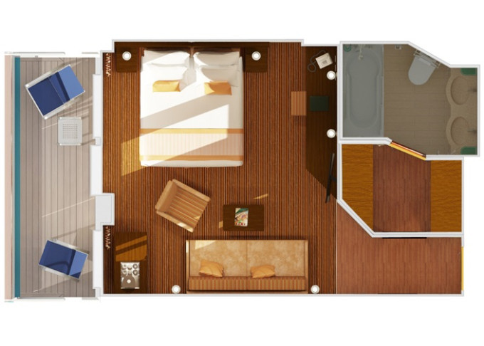 OS - Ocean Suite 25 m² + balkón 6 m². 7. paluba vpredu, stred. Max 4 osoby. Výhody Suite. | 4 804 € 2 402 € za osobu |