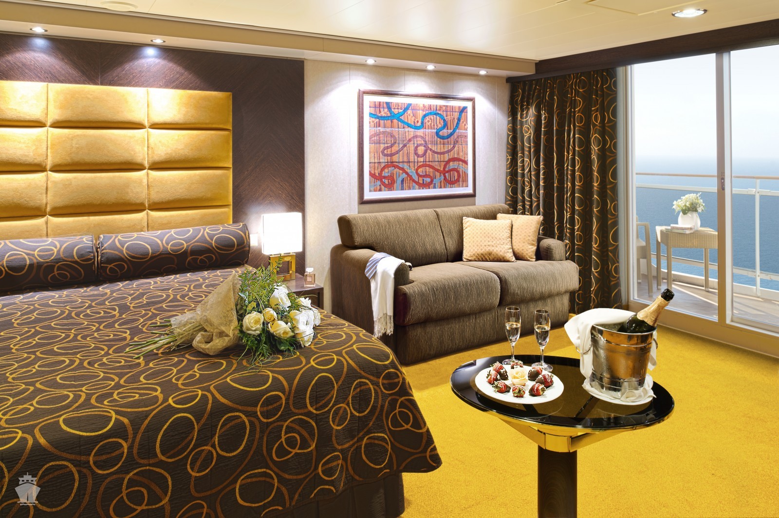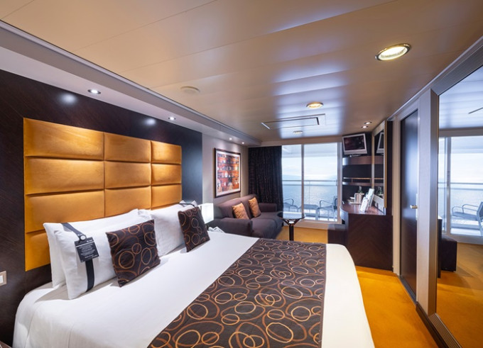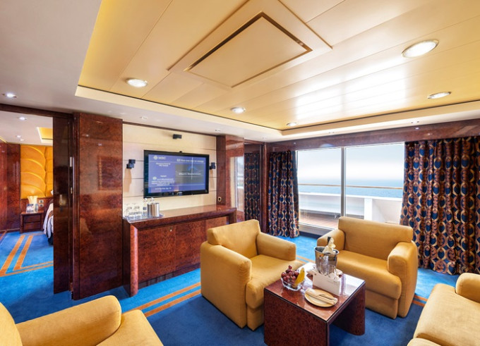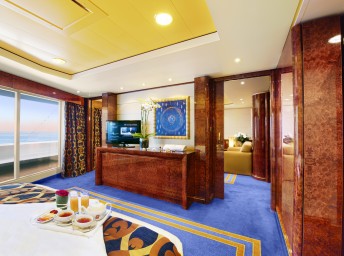 Suite s balkónom/panoramatickým oknom: cca32m²(Royal suite: 52m², Family suite: 45-53m², Deluxe Suite: 32-39m², Aurea suite: 21-47m²), kajuta s manželskou posteľou (na požiadanie 2 oddelené postele) a rozkladacia pohovka. Klimatizácia, kúpeľňa s vaňou, toaletný stolík, priestorná skriňa, interaktívna TV, telefón, minibar, sejf, sušič na vlasy. Balkón so stolíkom a stoličkami/panoramatickým oknom. Internetové pripojenie (za poplatok).