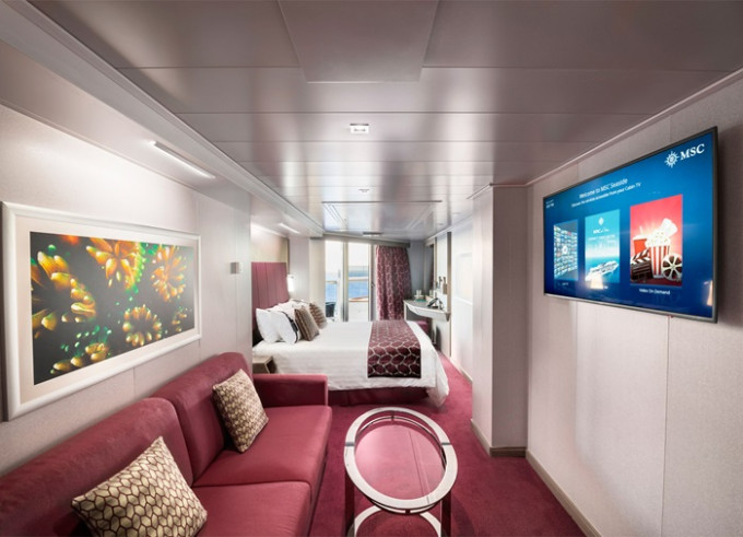 YC1 - Yacht Club Deluxe Suite 25 m² + balkón 8 m². Spálňa s obývacou časťou, šatník. Max 5 osôb. 16-18. paluba. Cenový model MSC Yacht Club. | 20 031 € 6 677 € za osobu |