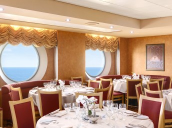 Hlavná reštaurácia Marco Polo (5. paluba) s kapacitou 758 hostí. Otvorená ako voľné sedenie na raňajky 7:00-9:30 a obed 12:00-14:00. Pri večeri je zasadací poriadok a turnusy o 18:15 a 20:45.