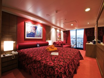 Suite s balkónom: cca 31m² kajuta s manželskou posteľou (na požiadanie 2 oddelené postele) a rozkladacia pohovka. Klimatizácia, kúpeľňa s vaňou, toaletný stolík, priestorná skriňa, interaktívna TV, telefón, minibar, sejf, sušič na vlasy. Balkón so stolíkom a stoličkami. Internetové pripojenie (za poplatok).