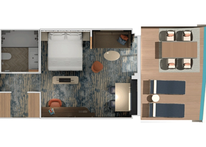 HU - Suite Havana Cabana Corner 33 m² + vonkajšie rohové patio 15 m². 8. paluba vpredu. Max 3 osoby. Tropický štýl, vstup do exkluzívnej zóny Havana. Výhody Suite. | 5 138 € 2 569 € za osobu | ||