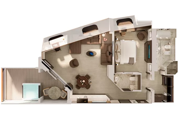 Retreat Residence Suita 63 m² + Terasa s vírivkou a sedením 14 m² / 7. paluba: 18 m². Spálňa s obývacou a jedálenskou časťou, šatník. Koktailová súprava, minibar, kávovar, vodná kanvica, ďalekohľad, sejf, mramorová kúpeľňa s vaňou a sprchou, extra wc. Taška Technogym Case Kit. Fľaša šampanského na privítanie. Služby osobného majordóma. Maximálna kapacita 3 dospelí alebo 2 dospelí + 2 deti pod 18 rokov. | 23 940 € 23 940 € za osobu | ||