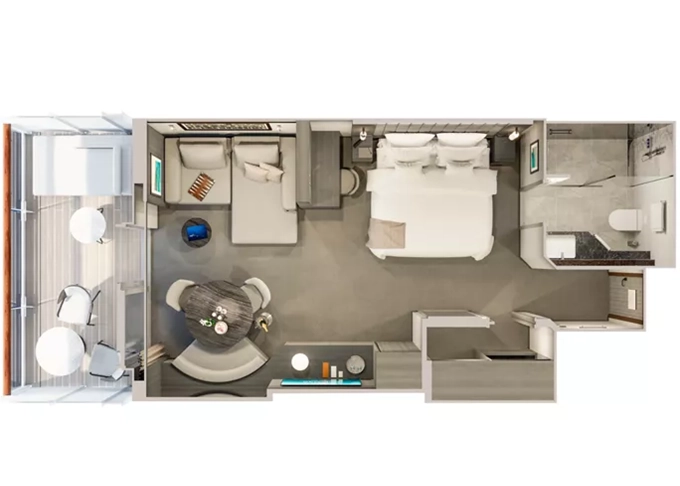 Ocean Residence - Cove Residence Suita + terasa so sedením a lehátkami 56 m². Spálňa s obývacou a jedálenskou časťou, šatník. Koktailová súprava, minibar, kávovar, vodná kanvica, ďalekohľad, sejf, kúpeľňa so sprchou. Závesy, svetlo, klimatizácia ovládané smart technológiou. Taška Technogym Case Kit. Fľaša šampanského na privítanie. Maximálna kapacita 3 osoby. | 35 372 € 8 843 € za osobu | ||