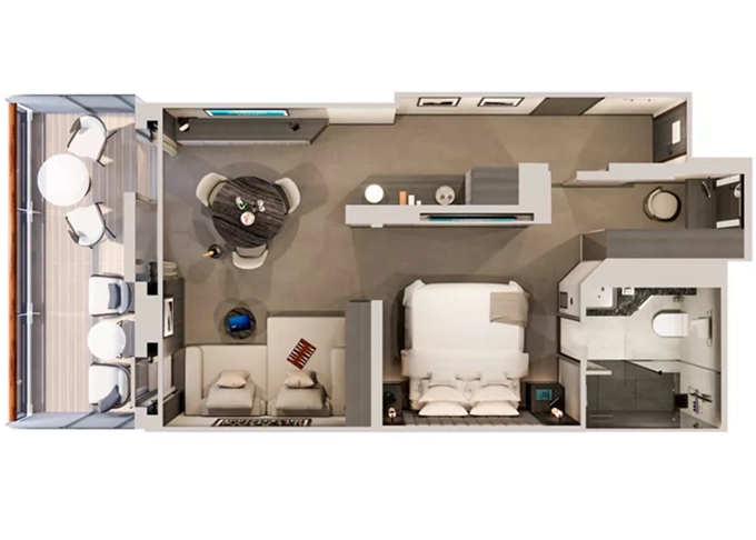 Ocean Residence - Cove Residence Suita + terasa so sedením a lehátkami 56 m². Spálňa s obývacou a jedálenskou časťou, šatník. Koktailová súprava, minibar, kávovar, vodná kanvica, ďalekohľad, sejf, kúpeľňa so sprchou. Závesy, svetlo, klimatizácia ovládané smart technológiou. Taška Technogym Case Kit. Fľaša šampanského na privítanie. Maximálna kapacita 3 osoby. | 30 312 € 7 578 € za osobu | ||