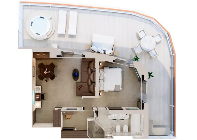 Ocean Residence - Cove Residence s vírivkou Suita + terasa s vírivkou a lehátkami 56 m². Spálňa s obývacou a jedálenskou časťou, šatník. Koktailová súprava, minibar, kávovar, vodná kanvica, ďalekohľad, sejf, kúpeľňa so sprchou. Závesy, svetlo, klimatizácia ovládané smart technológiou. Taška Technogym Case Kit. Fľaša šampanského na privítanie. Maximálna kapacita 3 osoby. | 21 280 € 21 280 € za osobu | ||